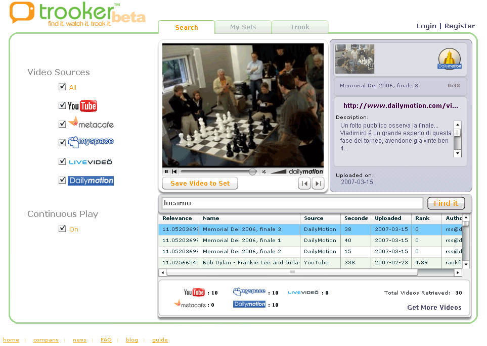Trooken è un motore di ricerca video che permette di trovare video provenienti da: