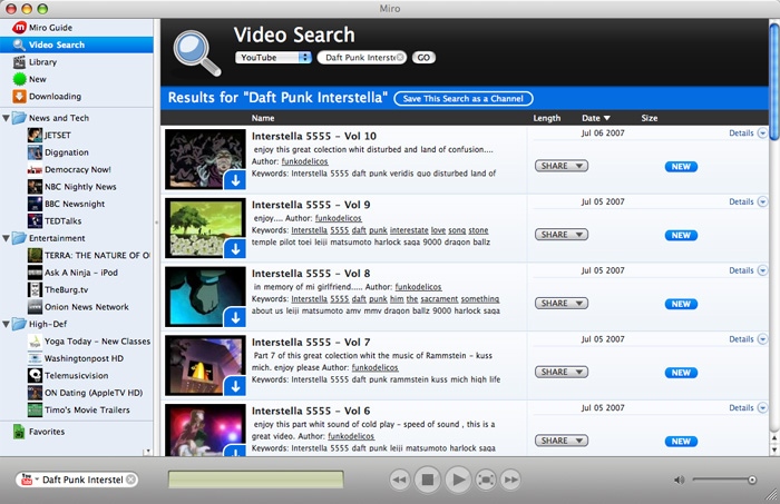 Recherche: la fonction de recherche permet d’accéder aux vidéo de YouTube, Veoh, Google Video, Blogdigger, Revver, DailyMotion et Blip.tv pour créer vôtre chaîne personnalisée.